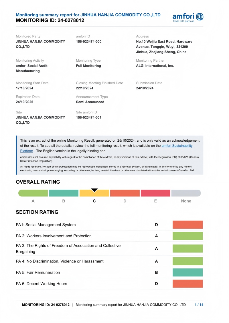 Nel luglio 2025,Jinhua Hanjia Commodity Co., Ltd.ha ottenuto con successo una certificazione di livello C nel programma di audit di fabbrica di classificazione internazionale per gli standard (ICS), condotto dall'agenzia di ispezione europea di terze parti nominata dall'Unione Cooperativa Enseigne. This certification system comprises four tiers: A, B, C, and D. As a member of the French Chamber of Commerce and Industry (FCD), the company adheres to the International Labour Organization's Social Management Scheme standard SA8000, implementing social responsibility audits on its suppliers.The audit scope covers critical areas including human rights, occupational health and safety, factory conditions, wages, and documentation compliance.