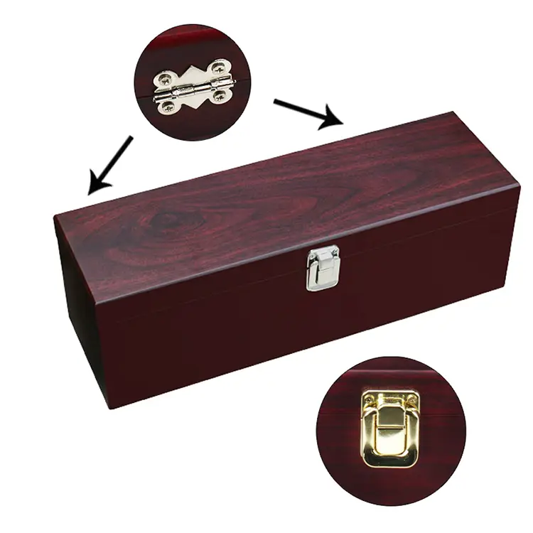 Ci sono tre parti metalliche sulla scatola, un fermo reversibile frontale e una cerniera sul retro. Queste parti metalliche sono disponibili in diversi stili e colori per la personalizzazione e la scatola può essere personalizzata in base al suo meccanismo di apertura. Dopo aver aperto il coperchio, ci sono strumenti di vino da 4 pezzi con Eva nascosta nella scatola. Tali accessori sono realizzati in acciaio inossidabile o in lega di zinco, con due di loro che incorporano palose rosse naturali, creando un armonioso equilibrio con la scatola di legno.
